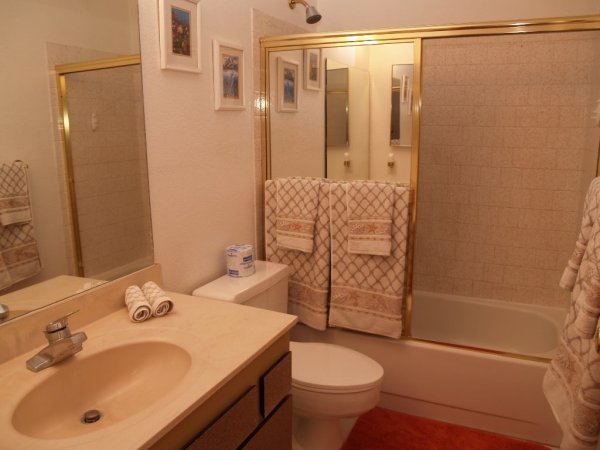 Project bathroom 2| before. Not too bad at first glance but mold in the corners, bathtub & vanity very old, tiles out of style |