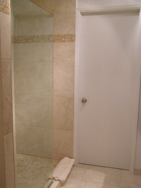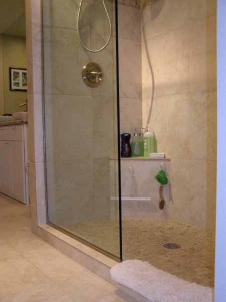 pebble stone floor, tiled walls w/ pebble stone border and glass wall; storage place in the corner |