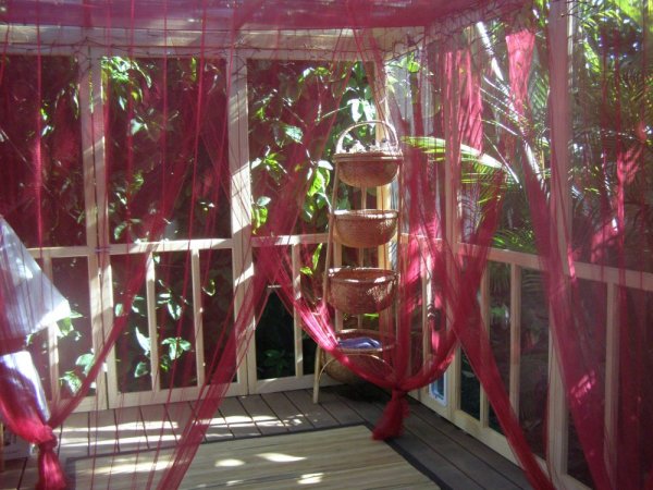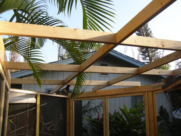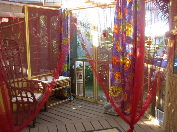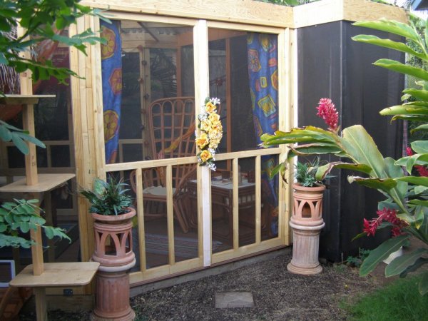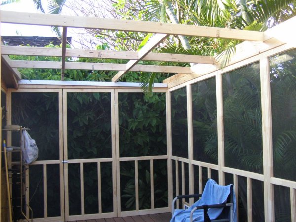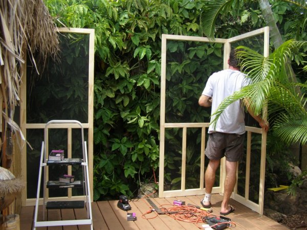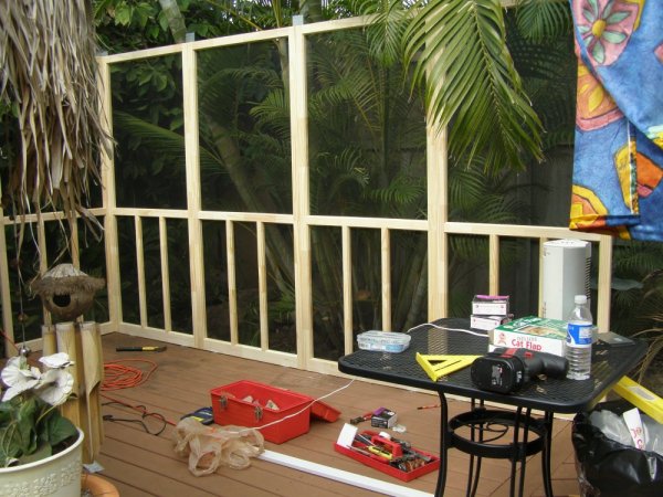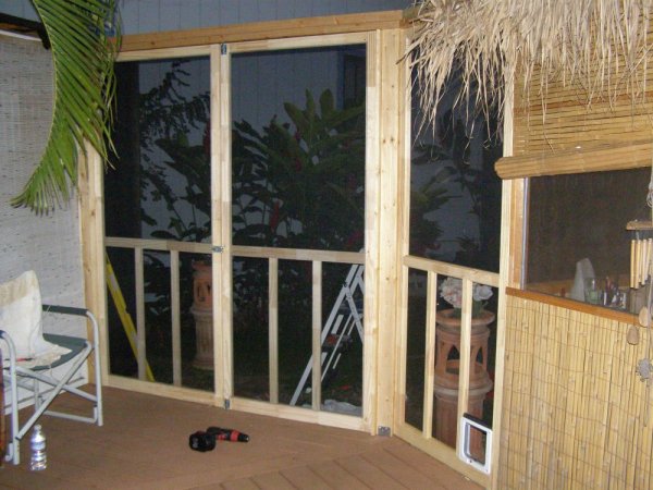 screened in to get a room protected from sun & rain. same screen doors were used as in project garden house and atteched to the deck |